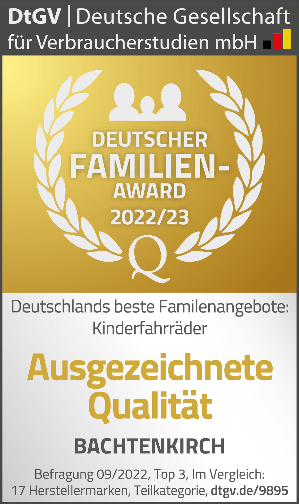 Als Orientierungshilfe für Eltern hat die Deutsche Gesellschaft für Verbraucherstudien (DtGV) viele Marken, Händler und Dienstleister mit familientypischen Produkten und Angeboten auf Kundenzufriedenheit untersucht. Über ein Online-Panel wurden die Zufriedenheitswerte aus 3.451 Interviews mit knapp 550.000 Datenpunkten ermittelt. Insgesamt standen 74 Segmente aus der Lebenswelt von Familien im Mittelpunkt der Untersuchung. Unter andrem das Segment „Kinderfahrrad“.