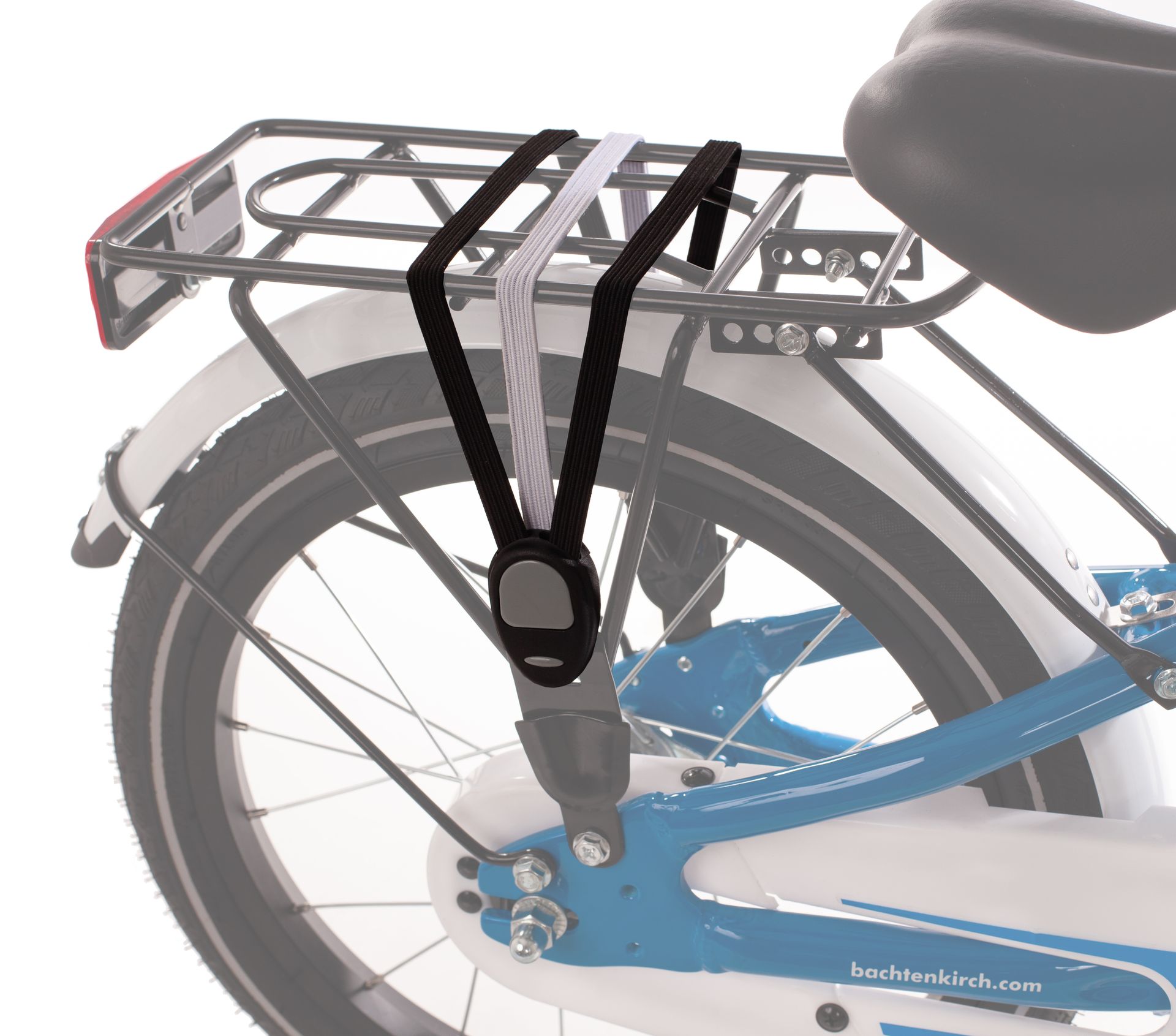 Richtig praktisch wird der Gepäckträger bei der Verwendung der passenden Spanngurte "Fixie". Die elastischen Dreifach-Gurte sind optional erhältlich. Die 36 cm Ausführung ist optimiert für die Größe 14 und 16 Zoll. Die 43 cm Ausführung entsprechend für die 18 Zoll Kinderräder. Für die einfache und sichere Aufnahme am Gepäckträger sind die Gurte mit Kunststoffhaken geliefer. UVP: 9,90 € pro Gurt.