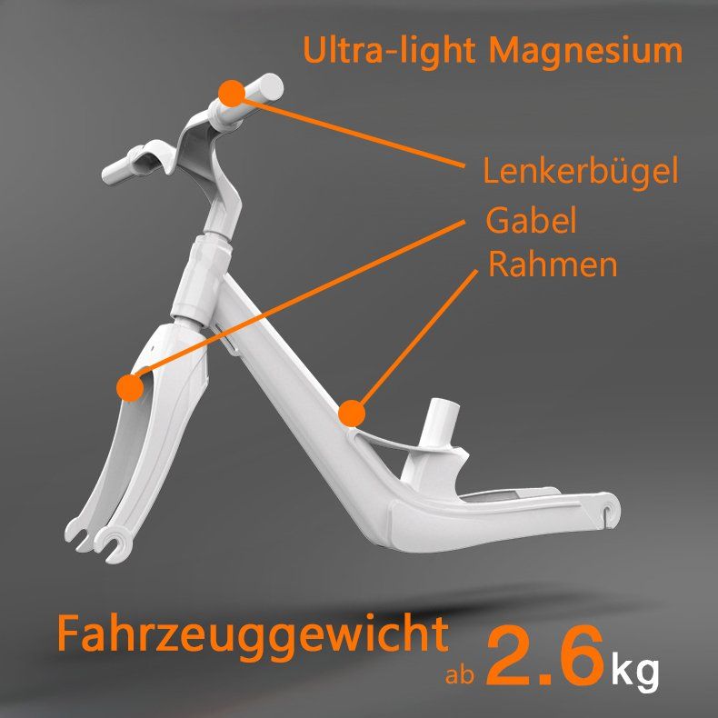 Normalerweise hat Leichtigkeit seinen Preis. Die Rahmen hochwertiger Lern-Laufräder von andren Markenherstellern werden insbesondere aus Aluminium gefertigt. Die unverbindlichen Preisempfehlungen der Produkte liegen dann um € 150,- bis € 180,- . Neben Aluminium gewinnt im Fahrzeugbau auch das noch leichtere Magnesium zunehmend an Bedeutung. Das Erdalkalimetall wird in Zukunft dem Fahrzeugleichtbau weiteren Schwung geben - denn Magnesium weist zugleich eine hohe spezifische Festigkeit auf. Als Element ist es nahezu unbegrenzt auf unserer Erde verfügbar. Der Abbau belastet nicht die Umwelt. Zudem punktet Magnesium auch durch seine sehr gute Recycelbarkeit als nachhaltiger Werkstoff.
