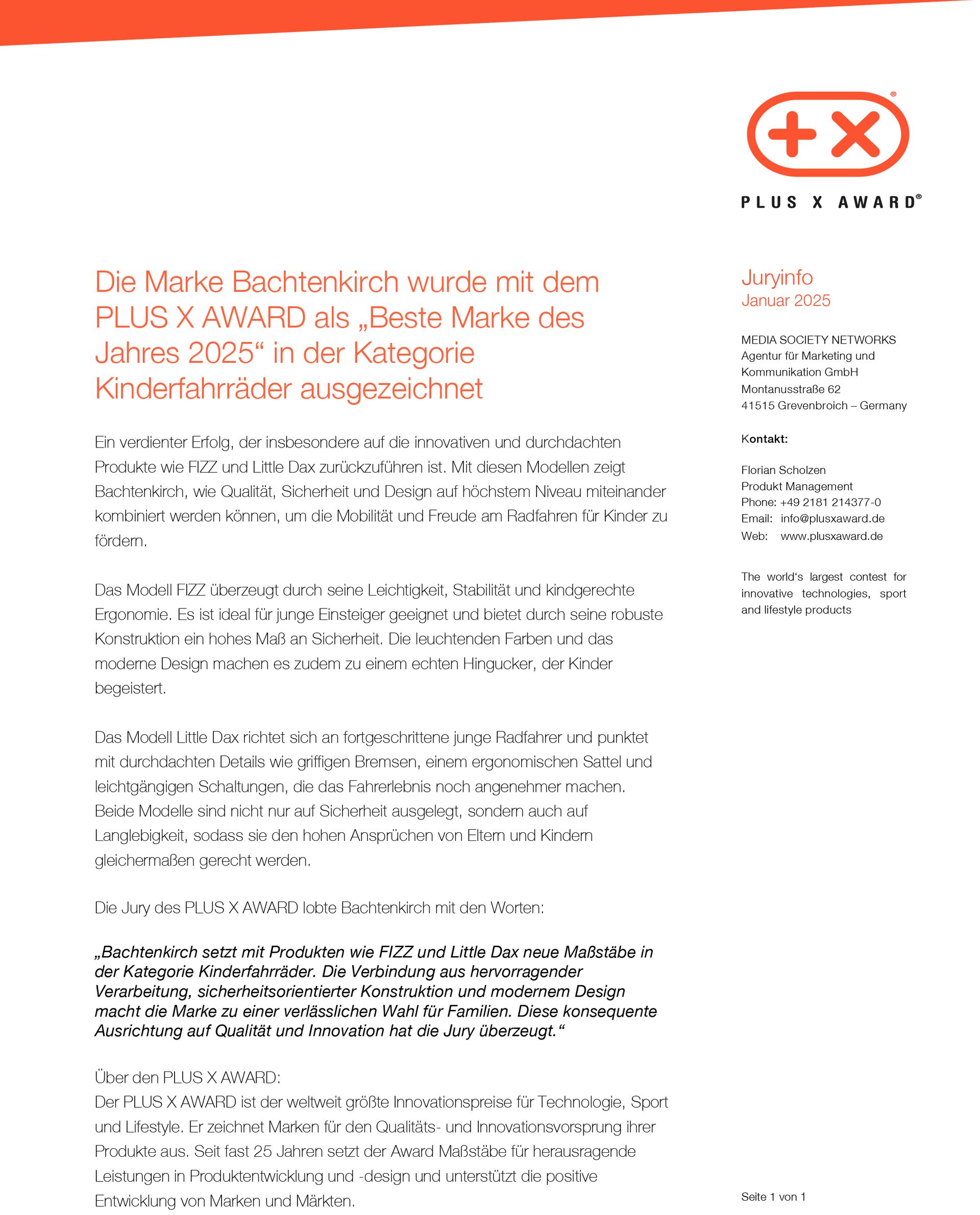 Die Jury des PLUS X AWARD lobte Bachtenkirch mit den Worten: "Bachtenkirch setzt mit Produkten wie FIZZ und Little Dax neue Maßstäbe in der Kategorie Kinderfahrräder. Die Verbindung aus hervorragender Verarbeitung, sicherheitsorientierter Konstruktion und modernem Design macht die Marke zu einer verlässlichen Wahl für Familien. Diese konsequente Ausrichtung auf Qualität und Innovation hat die Jury überzeugt."